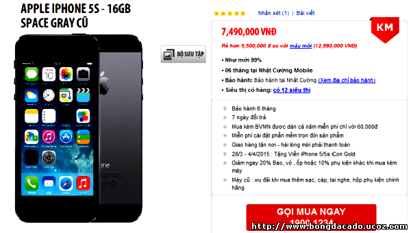 Chỉ với 7.49 triệu đồng bạn có thế sở hữu ngay 1 chiếc iPhone 5S mới đến 99%, chưa hề qua sữa chữa chỉ có tại Nhật Cường Mobile. Đặc biệt khách hàng có thể đổi trả điện thoại trong vòng 7 ngày đầu nếu sản phẩm có lỗi do nhà sản xuất. Đồng thời với chế độ bảo hành tận tình lên tới 6 tháng khách hàng hoàn toàn yên tâm trong quá trình sử dụng sản phầm. Khi đến với Nhật Cường Mobile khách hàng thật sự sẽ hài lòng về cách phục vụ cũng như dịch vụ tại nơi đây. Ngoài ra khi mua hàng online Nhật Cường sẽ giao hàng miễn phí đến tân nơi cho khách hàng. Khách hàng có thể thanh toán khi đã hoàn toàn hài lòng về sản phẩm.