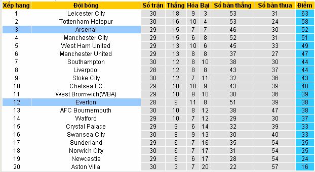 Arsenal đã chính thức dừng bước tại Champions League. Tại NHA, Arsenal đang tạm thời đứng ở vị trí thứ ba trên BXH với 52 điểm, kém đội đầu bảng Leicester tới 11 điểm song không vì thế đội bóng bắc London sẽ buông xuôi khi cơ hội vô địch vẫn còn nguyên. Nhắc lại, mọi chuyện đều có thể xảy ra khi giải NHA còn tới 8 vòng đấu nữa mới kết thúc và Arsenal vẫn còn 1 trận nữa chưa đá so với đội đầu bảng. Do đó dù có chuyến đi làm khách nhưng mục tiêu của đội bóng không chỉ dừng lại ở 1đ. Khi nhìn vào quá khứ đối đầu, có thể nhận thấy Everton là một trong những đối thủ yêu thích nhất của Arsenal tại NHA. Tính từ năm 2002 đến nay, Arsenal có tổng cộng 33 trận đụng độ Everton tại mọi mặt trận tham dự và trong đó họ thắng tới 21 trận, còn lại là 8 trận hòa và chỉ 4 lần để thua trước nửa xanh thành phố cảng Liverpool.