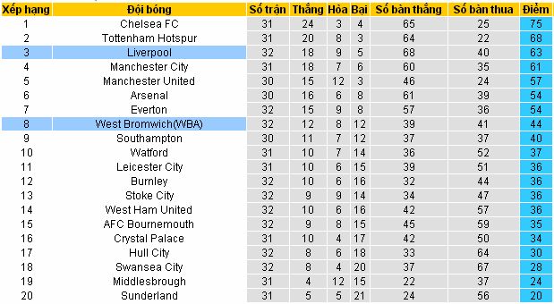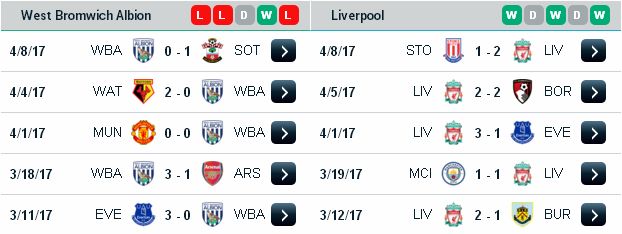 Đội hình dự kiến West Brom: Foster; Nyom, Evans, McAulley, Dawson, Livermore, Fletcher, Phillips, Morrison, Brunt, Rondon. Liverpool: Mignolet; Lovren, Matip, Klavan, Clyne, Milner, Wijnaldum, Can, Firmino, Coutinho, Origi.