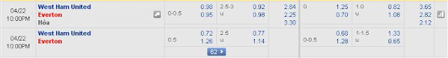 - Lựa chọn tài 1 trái ở hiệp 1: 7 trận gần nhất trên sân nhà của West Ham và 3 trận gần nhất trên sân khách của Everton đều xuất hiện bàn thắng ở hiệp 1. Con số này cũng xuất hiện tương tự trong 7/10 lần đối đầu gần nhất giữa 2 đội. Tin rằng với tính chất trận đấu không quá căng thẳng, tiền đạo xuất sắc Lukaku của Everton hay Osman, Darron Gibson and Tony Hibbert.G sẽ không bỏ lỡ cơ hội ghi bàn thắng ngay trước giờ giải lao.  Click xem kèo mới nhất