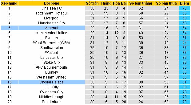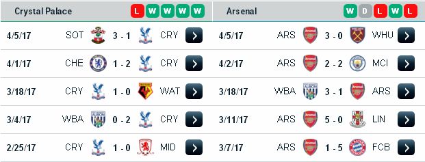 Có thể nói Crystal là đội bóng không biết tận dụng lợi thế sân nhà khi để thua 9/13 trận gần đây nhất. Hiện tại đội bóng ở vị trí thứ 16 trên BXH, nếu để thua Arsenal rất có thể CLB sẽ bị đẩy xuống vị trí 18 (tức là nhóm đèn đỏ rớt hạng). Vì thế thày trò HLV Sam Allardyce không được phép sai lầm. Cũng may thay đối thủ Arsenal gần đây cũng thi đấu khá chệch choạch đặc biệt là trên sân khách.