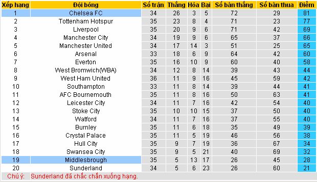 Tottenham để thua West Ham đêm qua chính là cơ hội bứt phá về đích không thể tốt hơn của Chelsea. Tính ra Chelsea còn một trận đấu quan trọng là chung kết cup FA sắp tới. Nhưng giải quyết đối thủ Middlesbrough (90% xuống hạng) là quá đơn giản khi mà "blue" đang có thể trạng tốt nhất. Chiến thắng này gần như là cú hích tinh thần để đội bóng nhẹ nhõm hơn khi bước vào trận quyết đấu ở FA cup.