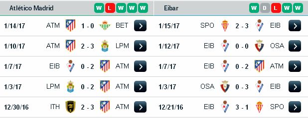 Cũng cần phải nhắc thêm, trong những lần đụng độ gần đây nhất, Atletico đều có được kết quả thuận lợi trước Eibar. Cụ thể, Atletico Madrid Griezmann và đồng đội toàn thắng cả 5 trận gần nhất đụng độ Eibar, trong đó có tới 4 trận thắng với tỷ số cách biệt từ hai bàn trở lên. Về phần đội khách, công bằng nhận xét Eibar đang có phong độ ổn định khi bất bại tới 6/7 trận vừa qua tại mọi mặt trận tham dư. Tuy nhiên, giới điêu mộ cần phải nhớ rằng trận thua duy nhất mà Eibar phải nhận ở 7 trận đấu trên lại là trận thua trước chính Atletico Madrid trên sân nhà tại La Liga.