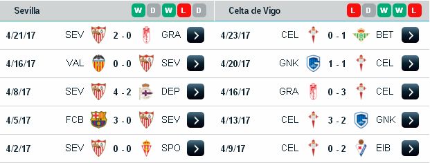 + Celta Vigo mất nhiều trụ cột: Marcelo Diaz (treo giò), Giuseppe Rossi, Ruben Blanco và Carles Planas (chấn thương). Chưa kể đến thành tích sân khách khá tệ mùa này, họ chỉ thắng được 4 trận nơi xứ người, còn lại hòa 4 và thua tới 8 trận thì rất khó để để Cetla Vigo làm nên bất ngờ trên sân của Sevilla.