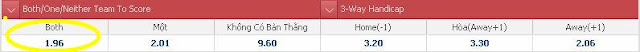 Thay vì đi theo hướng chấp trận và tài Xỉu thì tỉ lệ cược cho cả 2 đội cùng ghi bàn (chính là kèo Both/One/Neither Team To Score - chọn cột Both nhé) khá hấp dẫn. lý do: