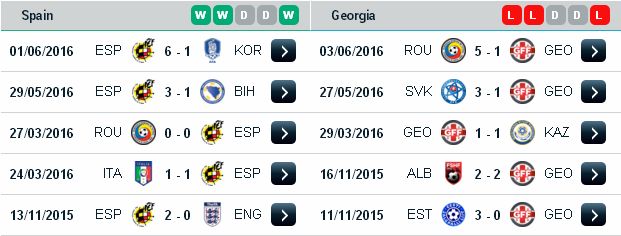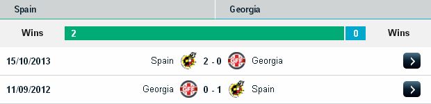 Thành tích đối đầu không nói ai cũng có thể đoán trước được Tây Ban Nha đang chiếm lợi thế, trong cả 2 lần chạm trán gần nhất Georgia đều thua và không ghi được bàn thắng nào. Trong chuyến hành quân đến Coliseum Alfonso Pérez mục tiêu đặt ra phải chăng chỉ là một lần chọc thủng lưới đối phương, còn vấn đề hòa hoặc thắng thì không nhiều người dám nghĩ tới.