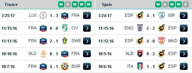 THÔNG TIN XUNG QUANH - ĐT Pháp: Vắng Sidibe và Rami vì chấn thương. - ĐT Tây Ban Nha: Vắng Diego Cosa vì chấn thương. - Theo châu Á, Pháp thắng 2 và thua 4 ở 6 trận gần đây; Tây Ban Nha thắng 4, hòa 1 và thua 1 ở 6 trận vừa qua. - Theo châu Á, Pháp thắng 2 và thua 3 ở 5 trận sân nhà gần đây; Tây Ban Nha thắng 2, hòa 1 và thua 2 ở 5 trận sân khách vừa qua. - Theo châu Á, Tây Ban Nha thắng 4 và thua 2 ở 6 trận gặp Pháp gần đây