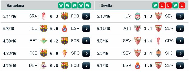 Barcelona và Sevilla bước vào trận chung kết Cup nhà vua TBN mà ở đó Barca được đánh giá khá cao. Với hơn 27 lần vô địch, Barca đang cho thấy lịch sử hào hùng của họ lấn át Sevilla. Trận chung kết tới đây Barcelona ngoài thủ môn Bravo còn bỏ ngỏ khả năng ra sân thì gã khổng lồ có đầy đủ những nhân tố tốt nhất của họ. Trong khi Sevilla sẽ không có sự phục vụ của tiền vệ Steven N'Zonzi do bị đình chỉ, còn Dehli và Benoit Tremoulinas cũng không thể ra sân do chấn thương. HLV Emery khả năng sẽ không thay đổi quá nhiều đội hình Sevilla sau chiến thắng trước Liverpool tai chung kết Europa League. Gamerio chân sút chủ lực của họ là cầu thủ được đặt niềm tin nhất và sẽ có thể tạo bất ngờ.