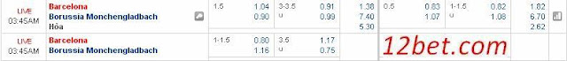 Chẵn bàn thắng Xem kèo bóng đá: 5 trận gần đây của Barca kết thúc với tổng bàn thắng là số chẵn. 9/12 trận gần đây của M’gladbach cũng có tổng số bàn thắng chia hết cho 2. Nên trận này có khả năng chẵn bàn thắng.