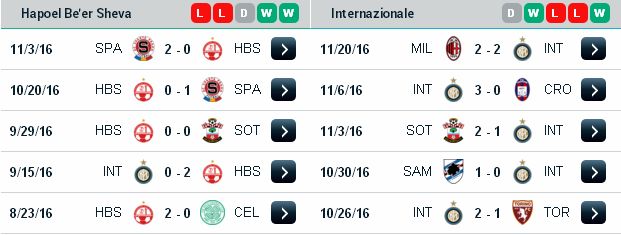 Hapoel Beer Sheva đã đem lại bất ngờ khi đánh bại Inter Milan ở lượt đấu đầu tiên ngay trên đất Italia, được chơi trên sân nhà đại diện Israel tự tin kiếm về một kết quả có lợi qua đó nuôi hi vọng đi tiếp của mình. Nên biết 12 lần đón khách vừa qua Hapoel Beer Sheva chỉ 1 lần đem về sự thất vọng cho CĐV, còn lại là 9 chiến thắng cả chuyên môn và TLCA. Với màn trình diễn ấn tượng của mình NHM Hapoel Beer Sheva kỳ vọng đội bóng con cưng một lần nữa đem lại bất ngờ tại Europa League.