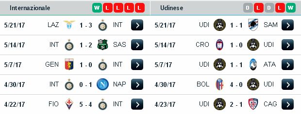 Đơn giản vì Udinese cũng đã không thắng 4 trận gần đây trong bối cảnh đã an toàn từ lâu. Điều đáng nói, thành tích xa nhà của thầy trò Luigi Delneri rất tệ ở giai đoạn lượt về trong năm 2017: thắng 1, thua 6, hòa 2. Lịch sử viếng thăm Giuseppe Meazza cũng rất hiếm khi đem lại niềm vui cho đội bóng có lịch sử lâu đời thứ 2 Serie A. Cụ thể, Udinese thắng 6, thua 13 trong 23 trận đụng độ Inter. 4 trận gần nhất CLB này toàn thua, để thua ít nhất 2 bàn mỗi trận.