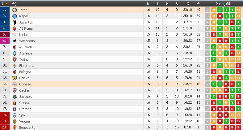 Trái lại, Udinese vừa thắng 2-0 trước Benevento, hiện họ đã dẫn trước nhóm xuông hạng 7 điểm khi chỉ thi đấu 16 trận. Hai mùa giải này, mỗi khi đối mặt với Inter Milan, họ đều bị áp chế và bị đối thủ ghi tới 14 bàn, cho thấy chênh lệch cách Inter Milan khá xa.