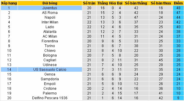 Bởi đối thủ của họ ở vòng đấu này chỉ là Sassuolo. Sau 21 vòng đấu, đôi bóng này chỉ có được vị trí thứ 14 trên BXH với 24 điểm. Trong 8 trận gần nhất, đội chủ sân Città del Tricolore chỉ giành được 2 trận thắng trong khi thua tới 5 trận. Còn nếu chỉ tính riêng trong các chuyến hành quân xa nhà thì đoàn quân của HLV Di Francesco mới chỉ có được 1 trận thắng kể từ đầu mùa. Đã vậy ông sẽ mất sự phục vụ của 3 vị trí trong trận đấu này. Sassuolo đã khó nay còn khó hơn.