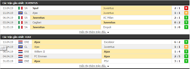 Juventus - Lợi thế hòa 1-1 lượt đi nên trận lượt về nếu thắng hoặc cầm hòa 0-0 Juventus có vé đi tiếp - Việc Juventus không có đối thủ giải Serie A không phải bàn nhưng bước ra ngoài biên giới đó phong độ của họ không còn giữ nguyên. Nhìn lại các số liệu thống kê lượt đi Ajax chiếm sức ép cả 2 hiệp nhiều hơn. Và chính thủ môn Wojciech Szczesny mới là những người hùng thực sự giúp Juve giữ nguyên trận hòa 1-1. - Sau trận thắng Atletico 3-0 vòng 1/16 Champions League, chủ nhà chưa có trận đấu nào khiến CĐV hài lòng: Họ đã thua 2 trận trước Genoa và SPAL, vất vả kiếm được trận hòa Ajax ở lượt đi, cũng như thắng thiếu thuyết phục trước Empoli và Milan.