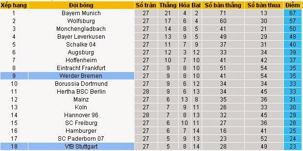 Với việc Paderborn đã bất ngờ giành chiến thắng trước Augsburg vào tối thứ 7, Stuttgart hiểu rằng mình sẽ buộc phải đánh bại Werder Bremen để duy trì khoảng cách 1 điểm kém hơn vị trí được đá play-off. Nếu như là 2 tháng trước rất khó để họ hoàn thành thì hiện tình hình ngược lại.