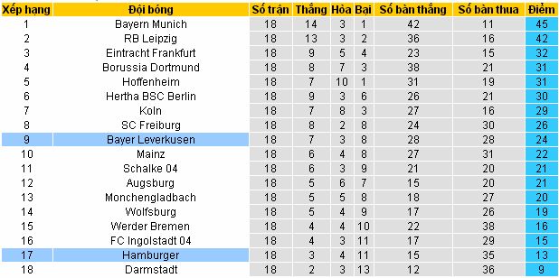 - Hamburger đang xếp thứ 17 trên BXH với 13 điểm; Bayer Leverkusen xếp thứ 9 trên BXH với 24 điểm.