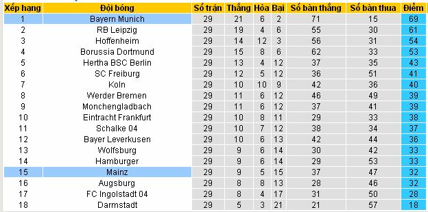 + Mainz gặp vô vàn khó khăn về nhân sự: Gaëtan Bussmann và Emil Berggreen sẽ vắng mặt trong trận đấu tối nay. Trong khi, cả Jhon Córdoba, Jean-Philippe Gbamin và Jairo Samperio chạy đua bình phục. Thành tích tệ hại thua 5/6 trận gần nhất khiến thày trò Schmidt ang vật lộn với cuộc chiến trụ hạng. au 29 trận họ chỉ có 32 điểm, chỉ đứng trên Augsburg (xếp thứ 17 - vị trí đá vé vớt để trụ hạng) nhờ hiệu số bàn thắng bại.