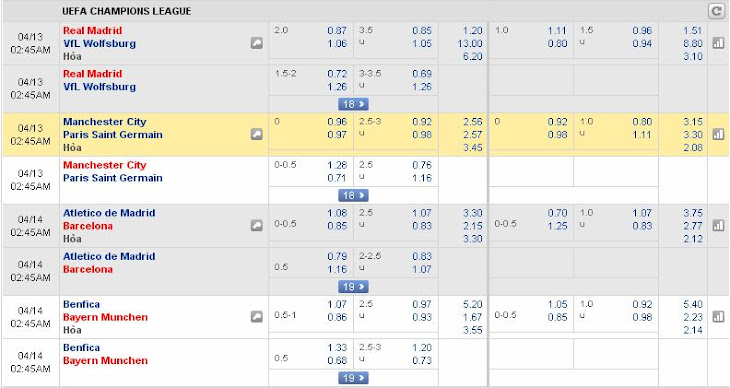 01h45 ngày 14/4 : Benfica (Bồ Đào Nha) vs Bayern Munich (Đức) 01h45 ngày 14/4 : Atletico Madrid (Tây Ban Nha) vs Barcelona (Tây Ban Nha)
