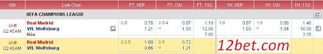 THÔNG TIN ĐÁNG CHÚ Ý Real: Varane và Benzema có thể thi đấu. Wolfsburg: Caligiuri và Jung chấn thương. Theo châu Á, Real thắng 3 và thua 2 ở 5 trận vừa qua, Wolfsburg thắng 1 và thua 4 ở 5 trận gần đây. Theo châu á, Real thắng 8 và thua 1 ở 9 trận sân nhà vừa qua, Wolfsburg thắng 3, hòa 1 và thua 5 ở 9 trận sân khách gần đây. Cả 9 bàn thắng gần đây của Real đều được ghi trong hiệp 2. 4/5 bàn thua vừa qua của Wolfsburg cũng diễn ra trong 15 phút cuối trận.