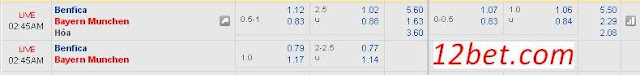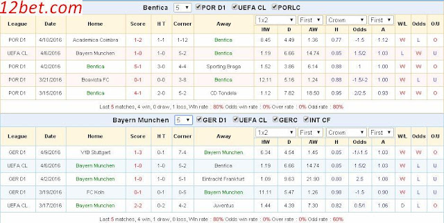 THÔNG TIN ĐÁNG CHÚ Ý Bayern: Vắng Boateng, Badstuber vì chấn thương. Benfica: Vắng Santos, Cesar và Gaitan vì chấn thương. Jonas bị treo giò. Theo châu Á, Benfica thắng tới 6/7 trận gần đây, trong khi đó Bayern thua tới 6/8 trận vừa qua. Trên sân nhà, Benfica chỉ thua 3/9 trận gần đây theo châu Á. Trên sân khách, Bayern thắng 4/11 trận gần đây theo châu Á. 5/6 trận sân khách gần đây của Bayern đều kết thúc với tổng số bàn thắng chẵn.