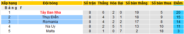 Romania - Nếu xét về điểm họ chỉ kém vỏn vẹn có 1 sau Thụy Điển, còn Tây Ban Nha đầu bảng đã chắc chắn có vé dự vòng CK Euro 2020. Tuy nhiên ở 8 lượt trận họ chỉ chơi tốt trước các đội bóng yếu hơn như Malta hay Đảo Faroe. Còn lại thua trước các đối thủ quá mạnh là Tây Ban Nha và Thụy Điển. Thậm chí trước Na Uy được đánh giá cùng đẳng cấp đội bóng của HLV Contra cũng không tìm ra điểm bứt phá và chỉ duy trì 2 trận hòa sau 2 lượt đi về