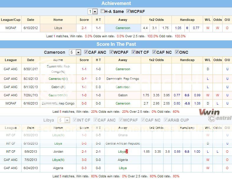 Phong độ gần đây của hai đội: Cameroon thắng 1/5 trận gần đây. Theo kèo Châu Á Cameroon thắng 2/5 trận gần đây Libya thắng thắng 3/5 trận gần đây. Theo kèo Châu Á Libya thắng 2/5 trận gần đây. 5 trận gần đây nhất của cả hai đội Cameroon và Libya đều là xỉu. Nhưng trận này là trận quyết định lên xuống hạng nên rất có thể cả hai đội sẽ thi đấu hết mình và nỗ lực đưa banh vào lưới. Cho nên trận này khả năng ra Tài rất cao.