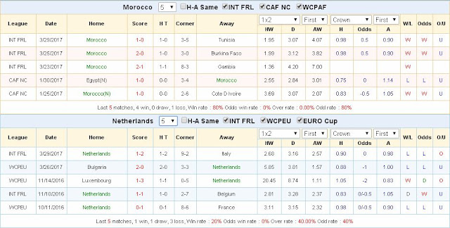 Morocco đang có thành tích khá tốt khi thắng liên tiếp 3 trận giao hữu trên sân nhà gần đây. Và đây là trận thứ 4 họ cũng sở hữu ưu thế sân nhà. Tuy nhiên gặp Hà Lan vấn đề sẽ không đơn giản. Mặc dù Hà Lan sẽ đá lượt trận ở vòng loại WC 2018 khu vực châu Âu khoảng 11/6 tới nên sẽ có sự thay đổi nhiều vị trí chủ chốt để thử nghiệm đội hình. Nhưng đẳng cấp giữa 2 nền bóng đá còn có khoảng cách lớn. Bản thân giải VĐQG Hà Lan cũng chuyên nghiệp nên các cầu thủ của họ được rèn luyện quanh năm. Nên không có gì ngạc nhiên khi "cơn lốc màu da cam" vẫn có nhiều cơ hội chiến thắng dù phải đi sân khách