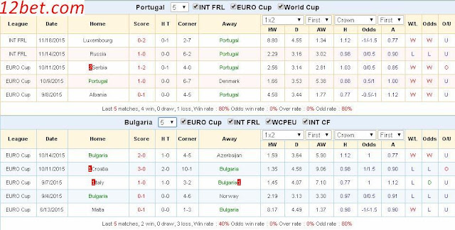Trận đối đầu gần đây về Xỉu. 6/7 trận vừa qua của Bồ Đào Nha có không quá hai bàn thắng. 4/5 trận mới đây của Bulgaria có kết quả tương tự.
