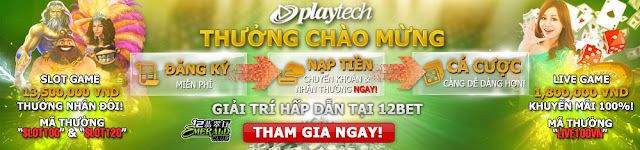 Các bạn yêu thích game Playtech thì tháng cuối năm này hãy mau mau đăng ký thành viên 12bet để nhận tiền thưởng nhân đôi cực hấp dẫn nhé. Live game mã thưởng "LIVE 100VN" tặng ngay ngay 1,800,000 vnđ. Slot game thì tiền thưởng tối đa lên tới 13,500,000 vnđ với mã thưởng "SLOT 100" và "SLOT 120"
