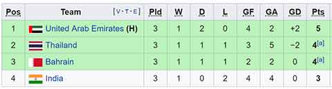 Lượt cuối bảng A đã diễn ra vô cùng kịch tính. Những tưởng Bahrain sẽ bị loại thì đúng ở phút 90, họ ghi được bàn thắng vào lưới Ấn Độ. Ở cùng thời điểm ấy, Thái Lan đã hòa 1-1 trước UAE.